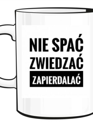 Kubek ceramiczny z trwałym odpornym na zmywanie nadrukiem.
